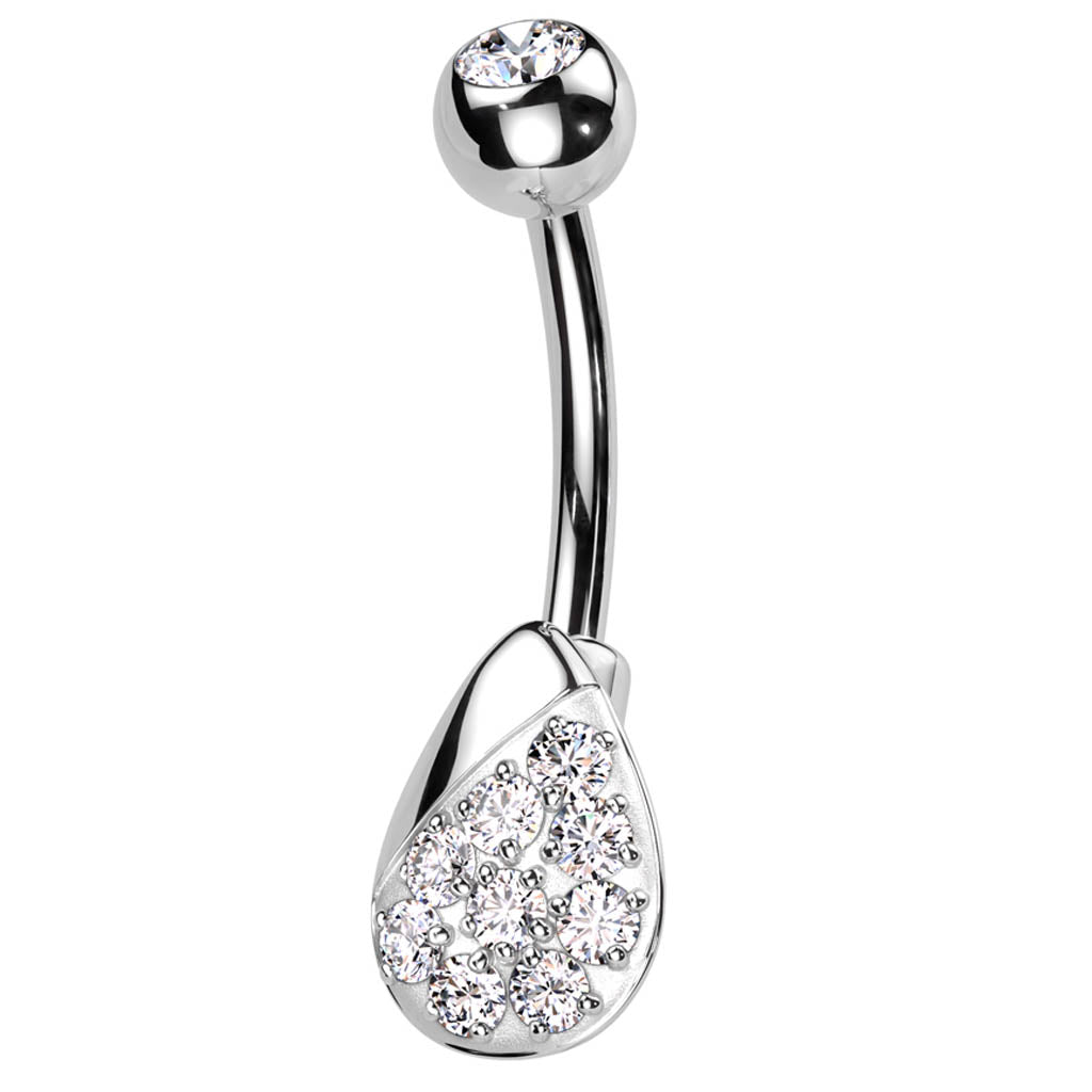Your belly button piercing will always sparkle when you wear this crystal filled button bar! This durable surgical steel curved barbell holds a dangling droplet shaped charm, filled with tiny sparkling crystals!