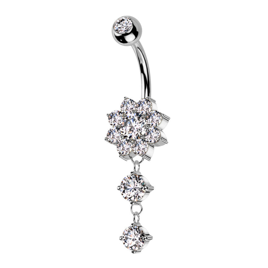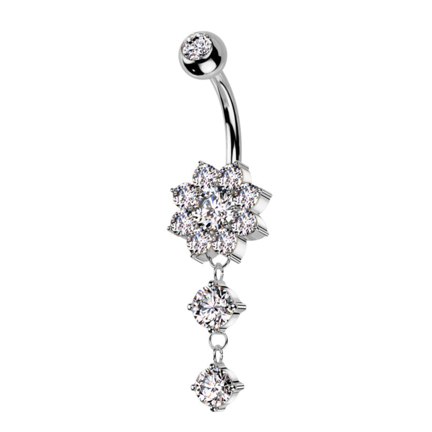 14 Gauge Double Dangling Crystal Flower Belly Bar