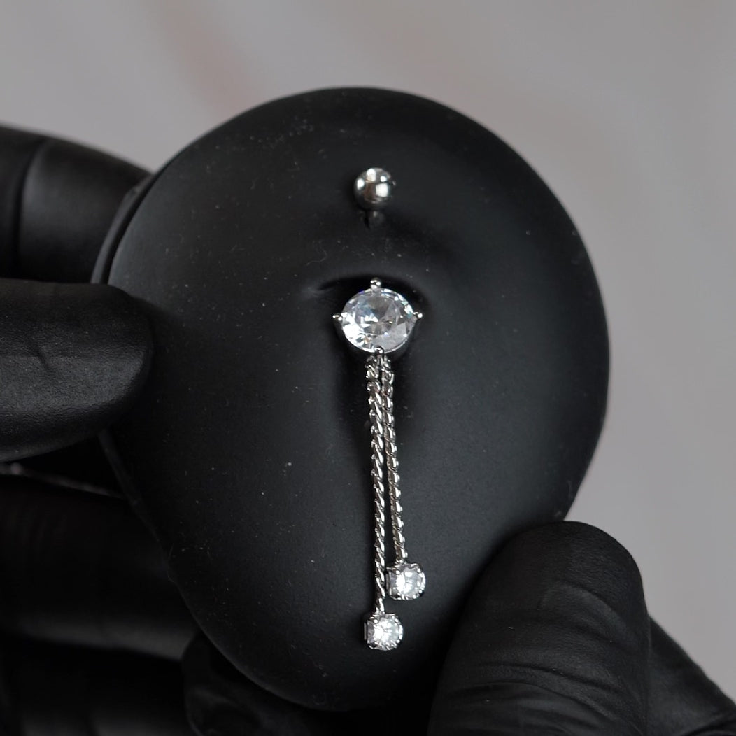 14 Gauge Double Dangling Crystal Chain Belly Bar