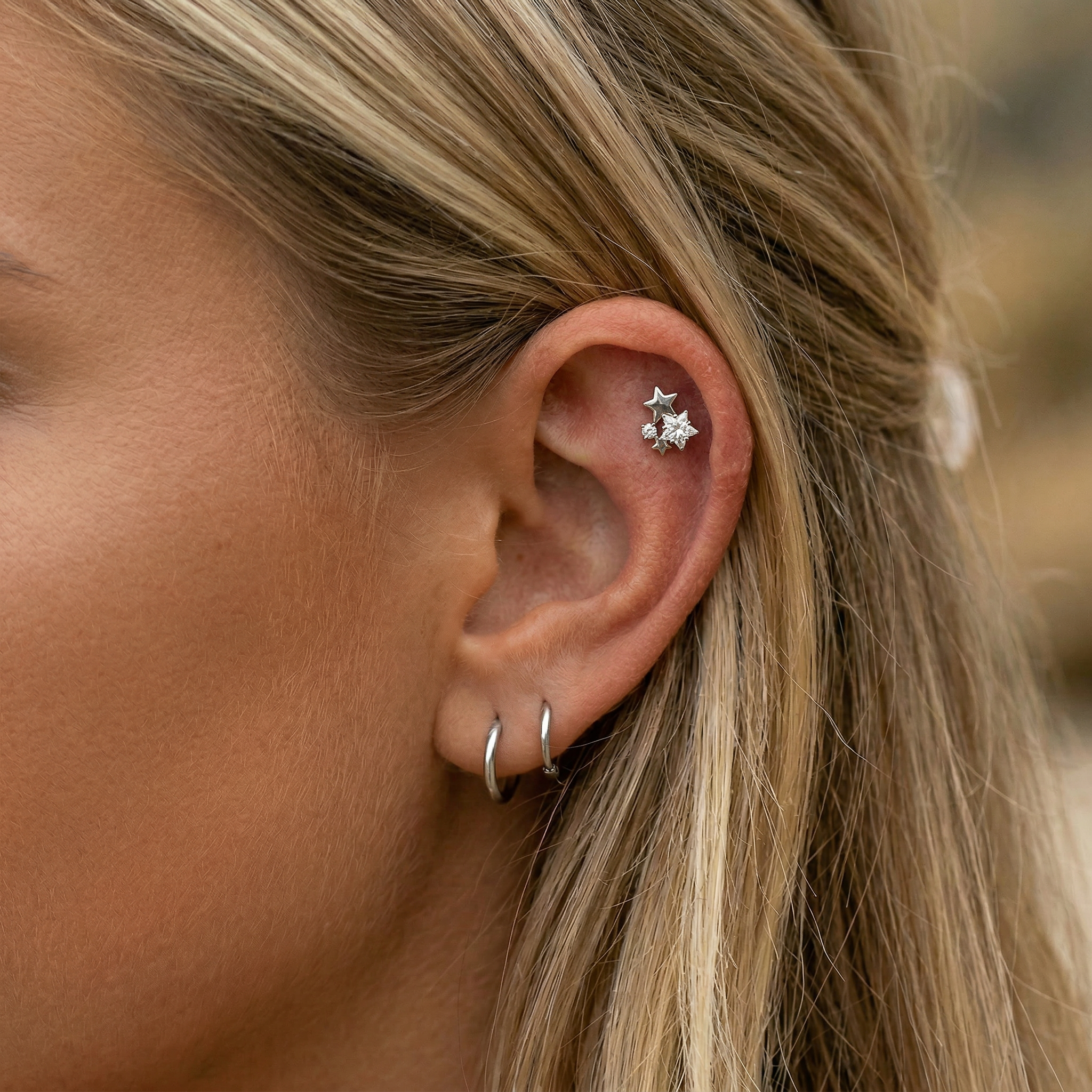 This adorable little stud internally threaded is made with a surgical grade stainless steel straight barbell with a flat back. It features an internally threaded topper featuring two dainty stars surrounded by tiny crystals. This stud will work beautifully in multiple cartilage piercings including the tragus, helix, conch, and more as well as a range of lip piercings.