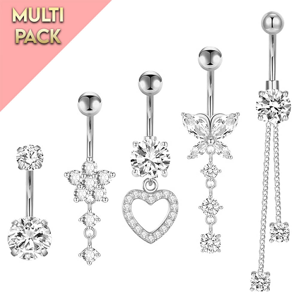 With this set of belly button bars you'll always be spoiled for choice! This set features an assortment of 5 surgical grade steel belly button bars, complete with crystal and crystal detail. Surgical grade steel is a great choice for most people with suitable for sensitive skin or allergies due to it's hypoallergenic properties.