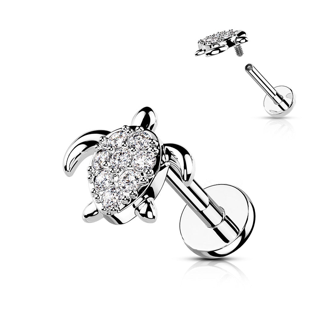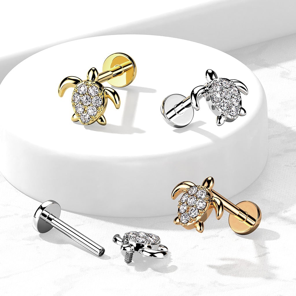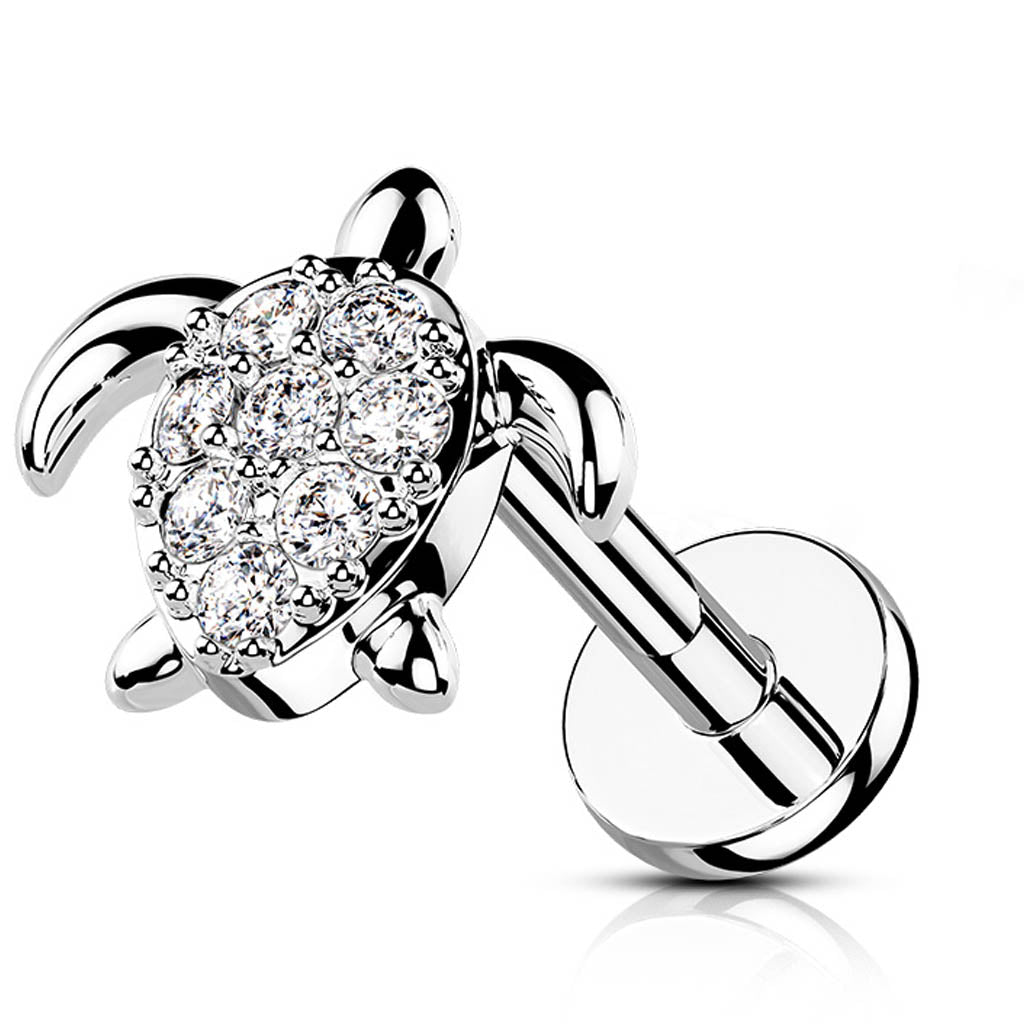 If you love turtles, then you'll love this 16 gauge cartilage stud, which is made with a durable surgical grade stainless steel straight post with a comfortable flat back end. It features an internally threaded dainty turtle charm filled with tiny crystals. This stud will work beautifully in multiple cartilage piercings including the tragus, helix, conch, and more.