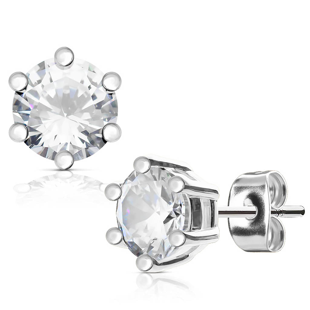 Let your lobes sparkle! This pair of tarnish free stainless steel studs feature a prong set crystal design combined with a straight post and butterfly backs. Stainless steel won't tarnish or discolour and is suitable for sensitive skin or allergies due to it's hypoallergenic properties. Sold as a pair.