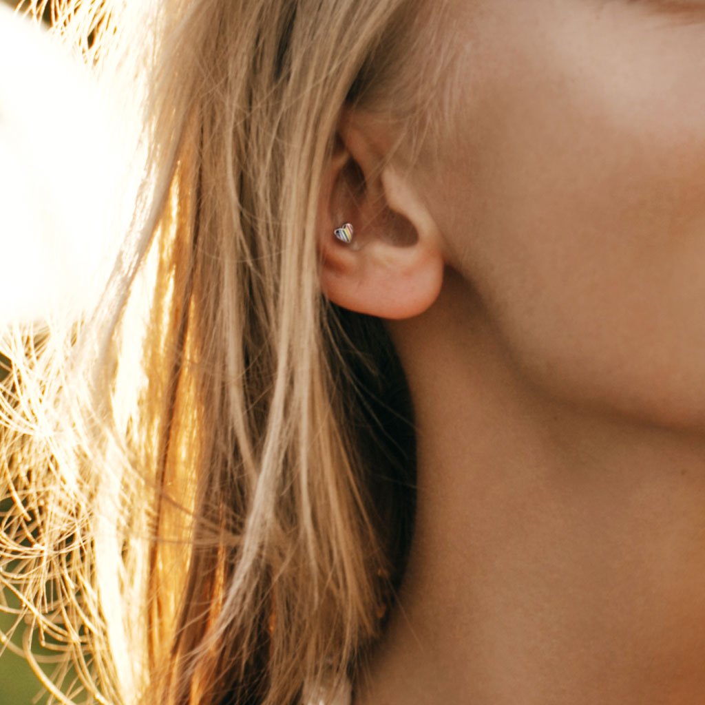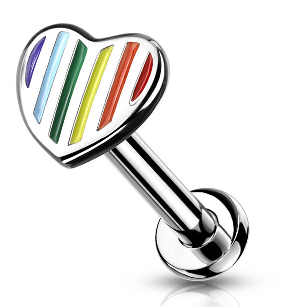 Show some love with this 16 gauge cartilage stud! It is made with a durable surgical grade stainless steel stud with a flat back end. It features an internally threaded rainbow design heart top. This stud will work beautifully in a wide range of cartilage and labret piercings.