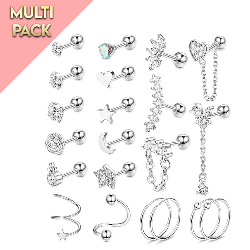 Adorn your ears with a different jewel every day, with this set of 6 silver tone hoops and 15 cartilage studs. This set of mixed gauge, surgical grade steel studs are suitable for a wide range of ear piercings including cartilage, tragus, upper lobes, helix and more! Surgical grade steel is a great choice for most people with suitable for sensitive skin or allergies due to it's hypoallergenic properties.