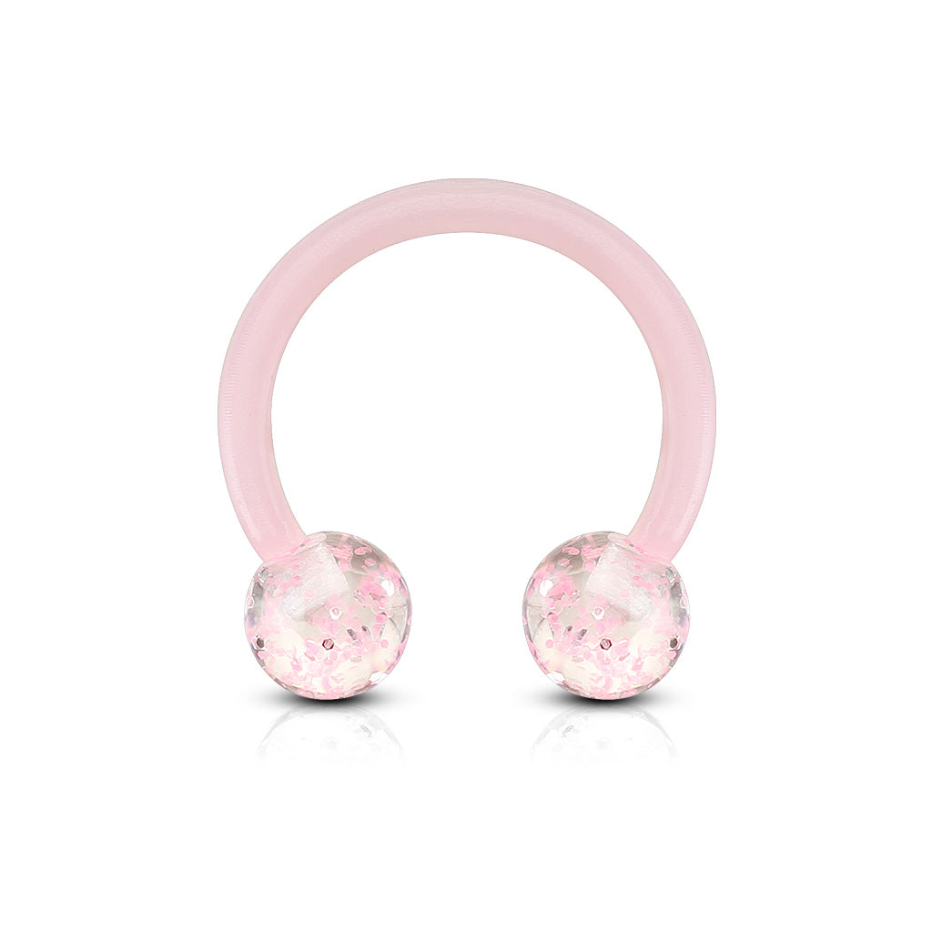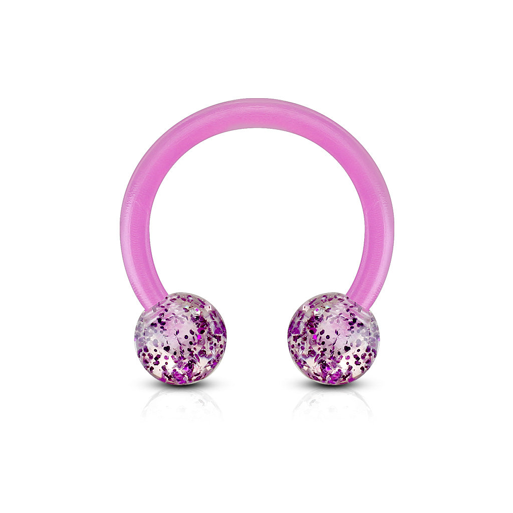 Take the classics and add a shot of glamorous style with this 16 gauge horseshoe barbell! It's made with a 10MM flexible acrylic barbell. It's externally threaded and features 4MM colourful glitter ball ends, adding a touch of lovely colour that's sure to get noticed. You can also wear it in multiple piercings including septum, helix, tragus, and some eyebrow piercings.