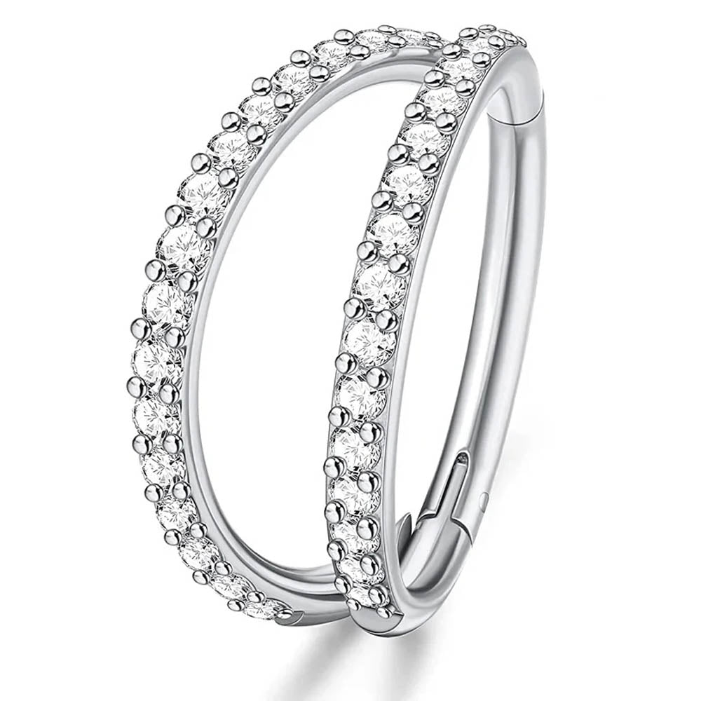 Add a touch of glamour to your cartilage piercings with this 16 gauge hinged hoop ring! It's made with durable implant grade titanium and features a hinged closure. Two rows of the hoop are paved with tiny clear cubic zirconia gems for a look that is luxurious. It also features a hinged segment that makes it easy to insert and remove. Titanium jewellery is hypoallergenic and won't tarnish, it's nickel free and perfect for those with sensitive skin or allergies - it's perfect to wear every day!